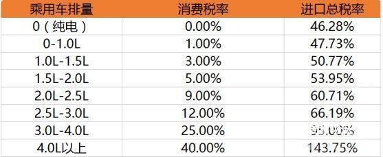目前国内分为8档,从0%到40%,与排量税成正比,因此也叫作“排量税”。无论是国产车还是进口车,厂商都需要交消费税。只不过进口车多了关税,复合之下,消费税率对总税率的影响进一步放大。